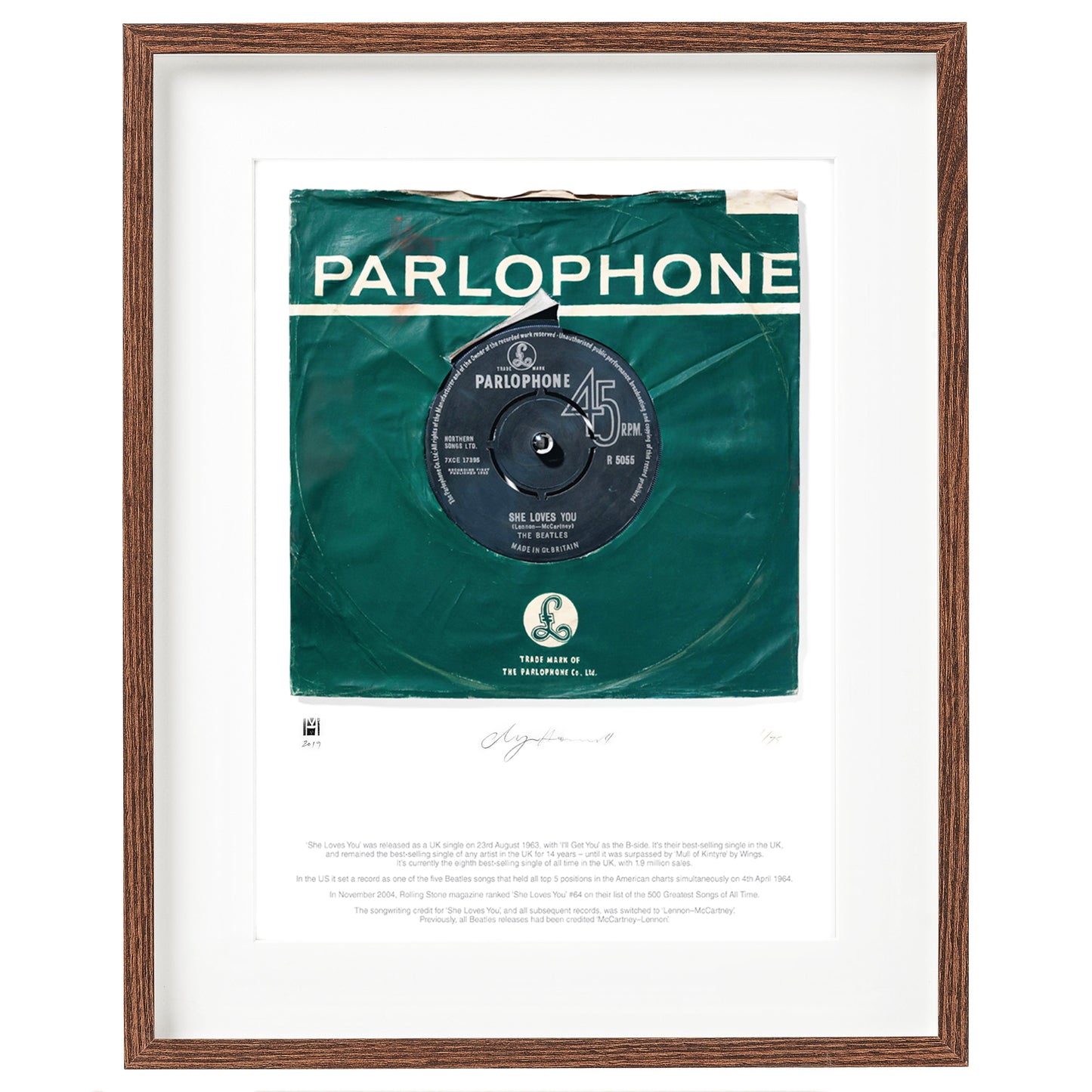 ‘She Loves You’ was released as a UK single on 23rd August 1963, with ‘I'll Get You’ as the B-side. It's their best-selling single in the UK, and remained the best-selling single of any artist in the UK for 14 years – until it was surpassed by ‘Mull of Kintyre’ by Wings. It's currently the eighth best-selling single of all time in the UK, with 1.9 million sales. In the US it set a record as one of the five Beatles songs that held all top 5 positions in the American charts simultaneously on 4th April 1964. In November 2004, Rolling Stone magazine ranked ‘She Loves You’ #64 on their list of the 500 Greatest Songs of All Time. The songwriting credit for ‘She Loves You’, and all subsequent records, was switched to ‘Lennon–McCartney’. Previously, all Beatles releases had been credited ‘McCartney–Lennon’.