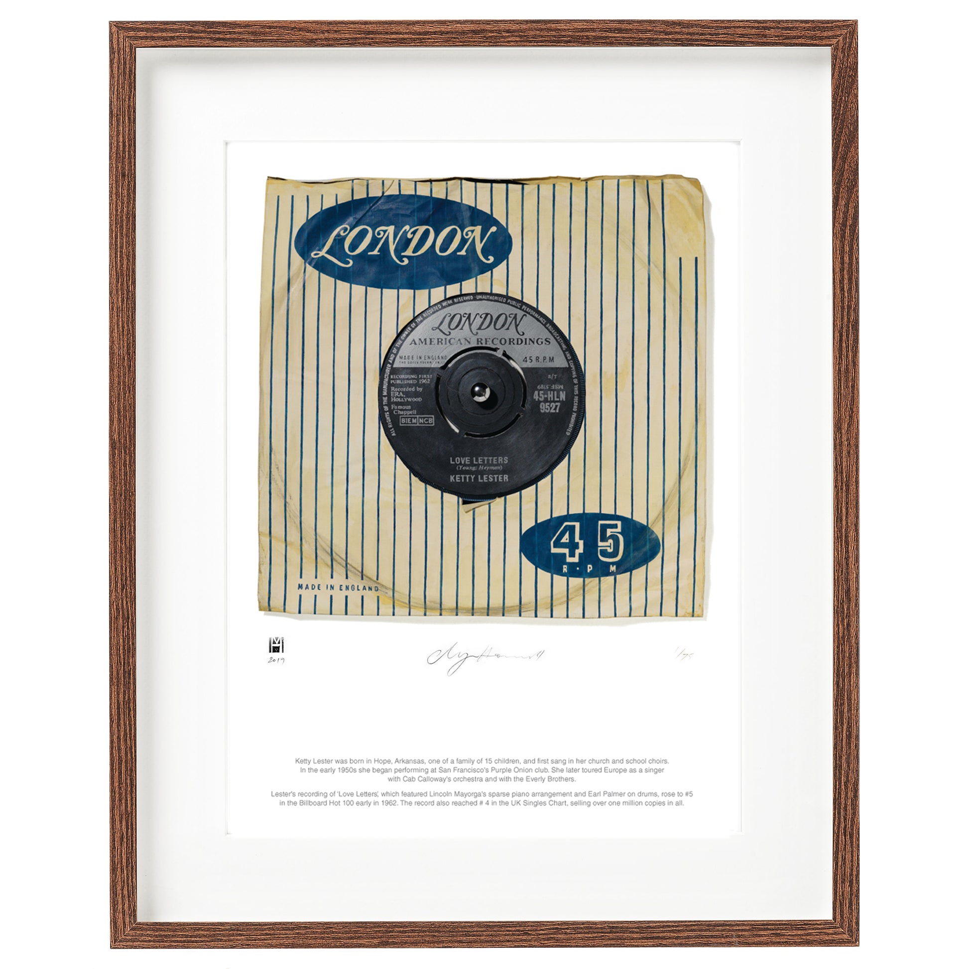 Lester's recording of ‘Love Letters’, which featured Lincoln Mayorga's sparse piano arrangement and Earl Palmer on drums, rose to #5 in the Billboard Hot 100 early in 1962. The record also reached # 4 in the UK Singles Chart, selling over one million copies in all.