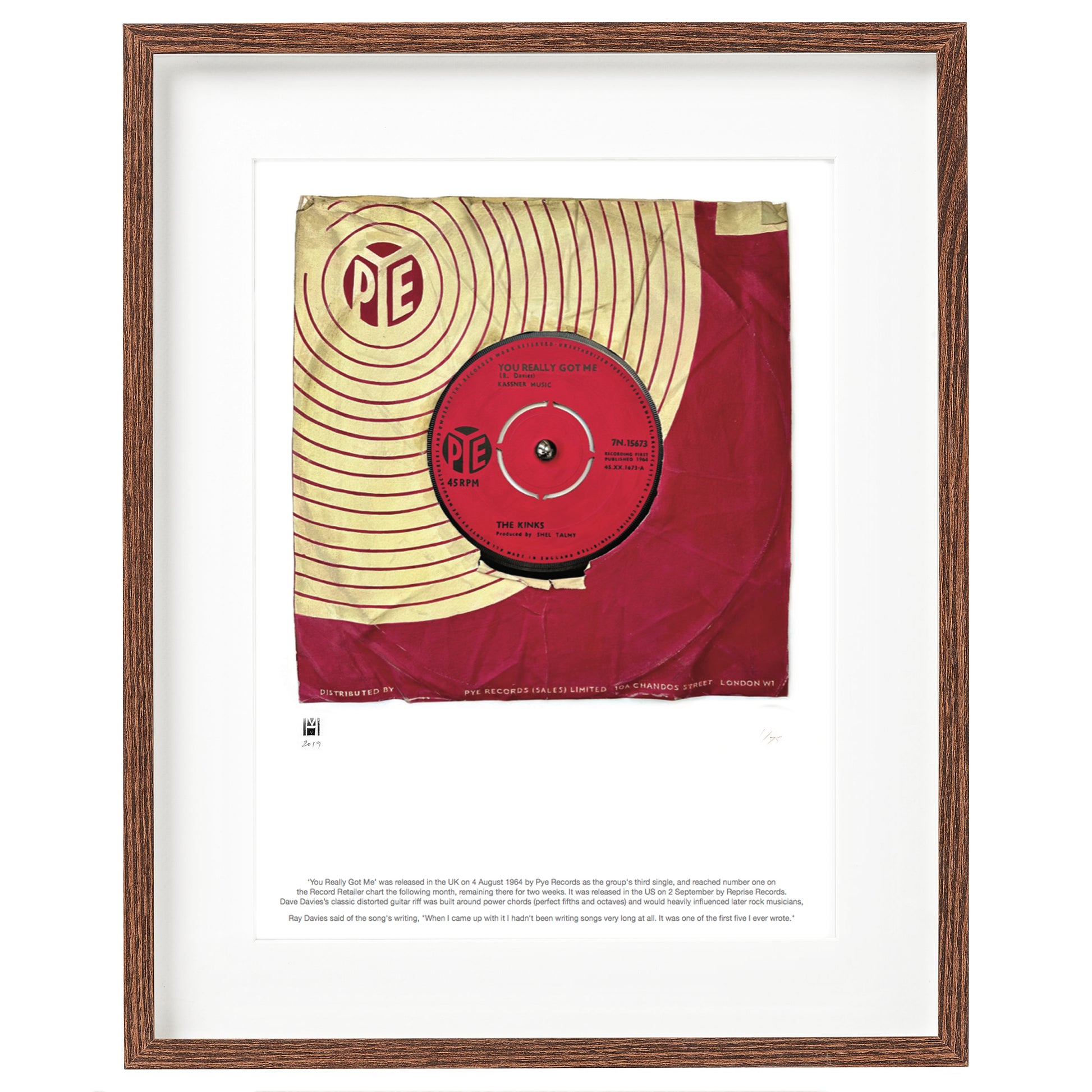 ‘You Really Got Me’ was released in the UK on 4 August 1964 by Pye Records as the group's third single, and reached number one on the Record Retailer chart the following month, remaining there for two weeks. It was released in the US on 2 September by Reprise Records. Dave Davies’s classic distorted guitar riff was built around power chords (perfect fifths and octaves) and would heavily influenced later rock musicians, Ray Davies said of the song's writing, "When I came up with it I hadn't been writing songs very long at all. It was one of the first five I ever wrote."